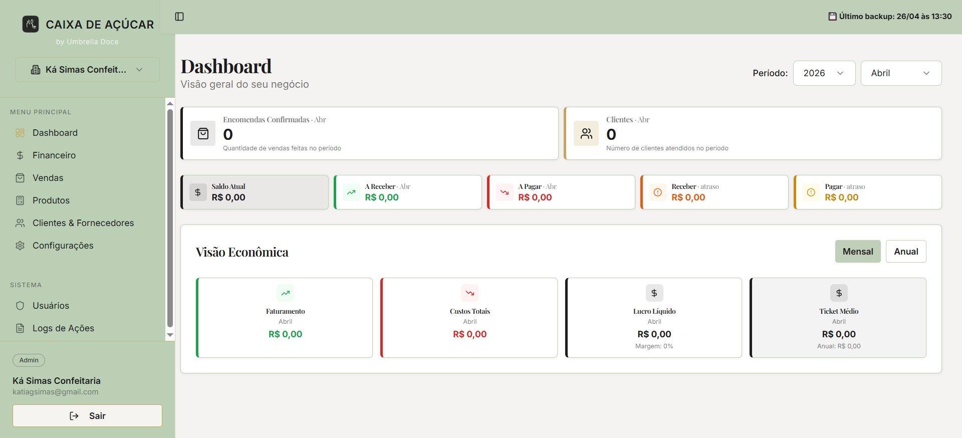 Receitas, despesas, fluxo de caixa. Tudo organizado da forma que faz sentido para quem faz kit festa.